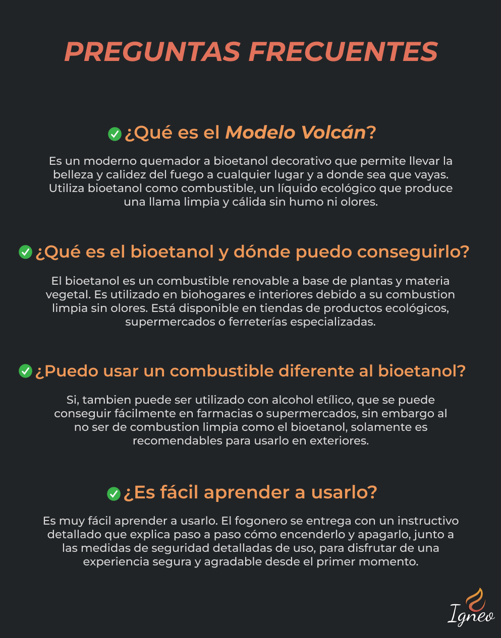 Sin las molestias del humo y las cenizas. El Fogonero Volcán utiliza bioetanol, un combustible ecológico que genera una llama pura y limpia sin dejar residuos. Ideal para una experiencia limpia y responsable con el medio ambiente.