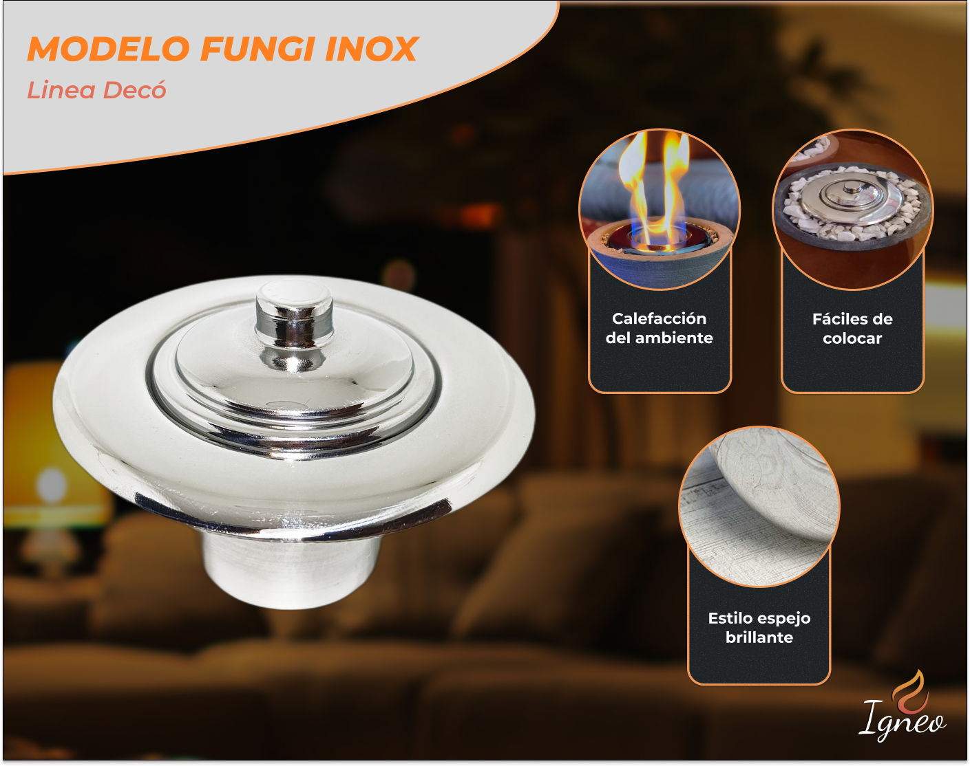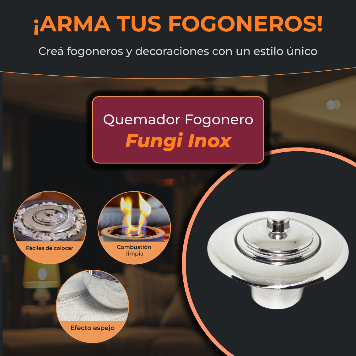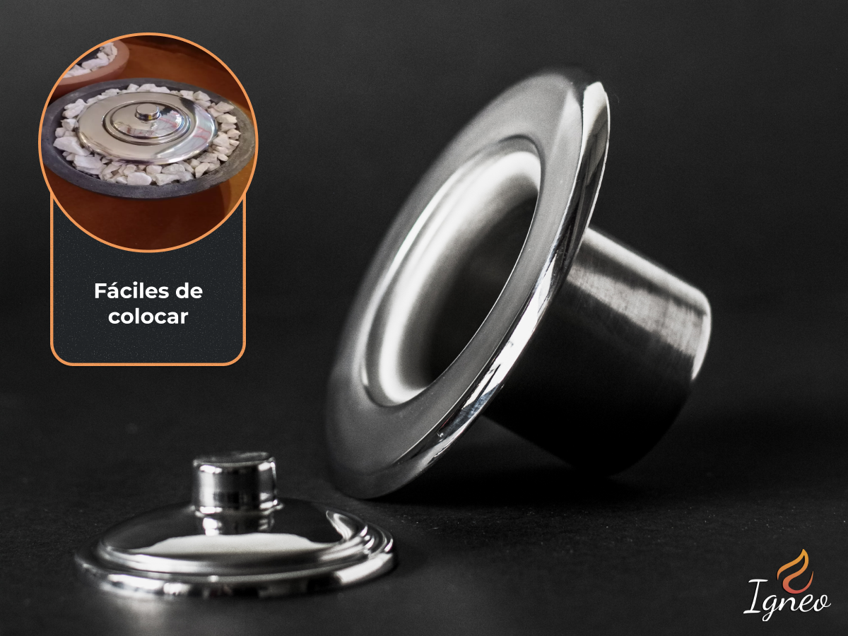 MODELO FUNGI INOX: Moderno quemador a bioetanol redondo de diseño exclusivo fabricado en acero inoxidable efecto espejo. Con un diseño ergonómico y empotrable, pensado para adaparse perfectamente en todo tipo de espacios, tales como fogoneros de mesa, mesas ratonas, fanales de hierro, entre otros; permite disfrutar del calor e iluminación del fuego de manera limpia y segura, en cualquier momento y lugar. Utiliza como combustible bioetanol, un alcohol derivado de materia vegetal el cual es limpio al quemar, por lo que no genera humo ni cenizas como muchos metodos tradicionales.